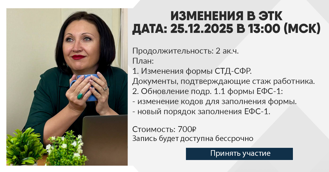 С 22.09.2025 обновлена выписки из ЭТК по форме СТД-СФР (приказ Минтруда России от 08.08.2025 N 489н). Из нее исключили таблицу со стажем до 31.12.2029 года. С 30.12.2025 в силу вступает новый порядок заполнения формы ЕФС-1 (Приказ СФР от 17.11.2025 № 1462).
